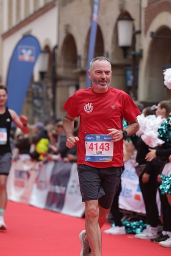 Vom TV Helmbrechts am Start war Udo Kremling, der an den Münstermarathon sehr gute Erinnerungen hat, erreichte er doch hier mit einer Zeit unter 3:30 Stunden vor gut zehn Jahren seine Marathonbestzeit. Ganz so schnell war diesmal nicht drin, aber als Ziel war 3:45 angepeilt. Bis zur Hälfte - Halbmarathondurchgangszeit war fast punktgenau 1:51 - lief es sehr gut. Die zweite Hälfte war dann mit knapp 2 Stunden etwas langsamer, der in den Außenorten doch recht böige Wind forderte sein Tribut. Schlussendlich konnte der Zieleinlauf mit 3:50:16 noch deutlich unter der magischen 4-Stunden-Grenze erreicht werden.