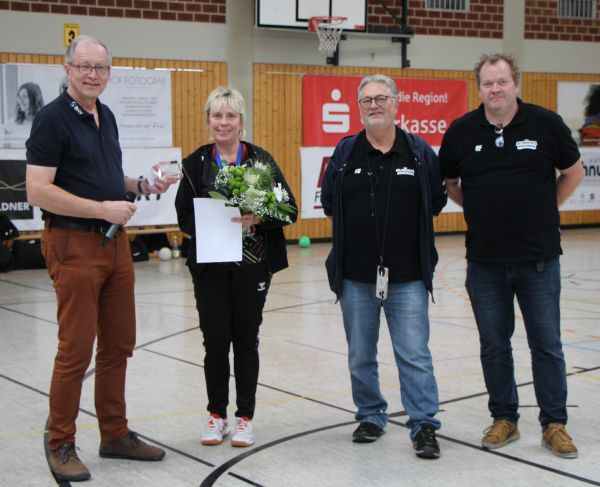 Die gesamte Zeit miterlebt und seit 48 Jahren als Übungsleiterin dabei ist Uta Reif. Der Bezirksvorsitzende K-D Sahrmann würdigte dieses außerordentliche Engagement mit dem Ehrenamtspreis des Bayerischen Handballverbandes.