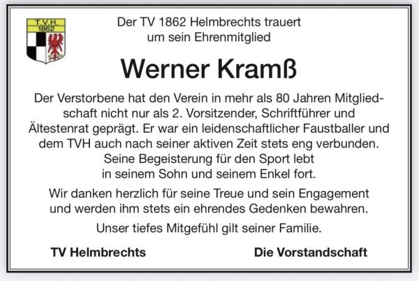 Werner Kramß war seit dem Jahr 1945 Mitglied im TV Helmbrechts und konnte damit auf die längste Vereinszugehörigkeit aller Mitglieder zurückblicken. Am 14. September 2025 ist Werner im Alter von 98 Jahren verstorben.